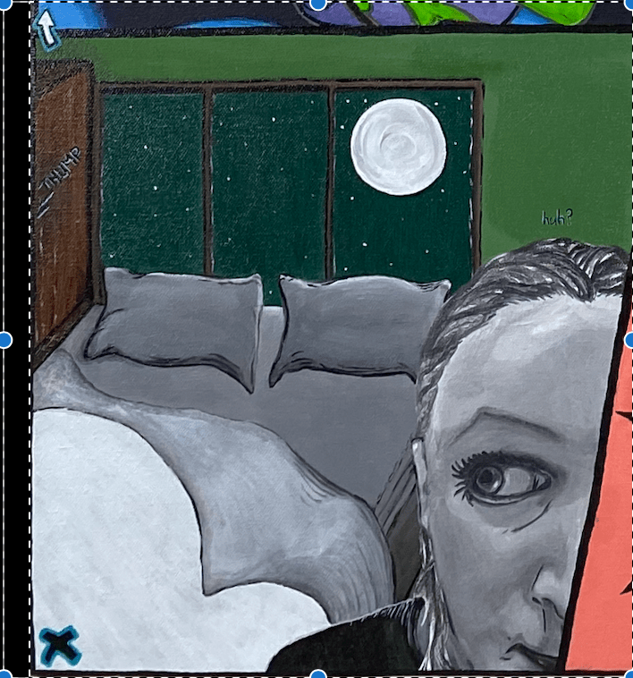 The image depicts a cartoon image of my younger self with full cheeks and healthy, curious eyes. Perhaps she heard a sound? Perhaps not. But the green background is more ominous than restful. When one watches old Disney movies or cartoons, quite often the evildoer with magic is surrounded by an evil green glow. This particular block alludes to such a thing. Although the room as I remember was peaceful and moonlit. It took many yearly rotations afterwards before I could look upon a moonlit evening with peace rather than anxiety.